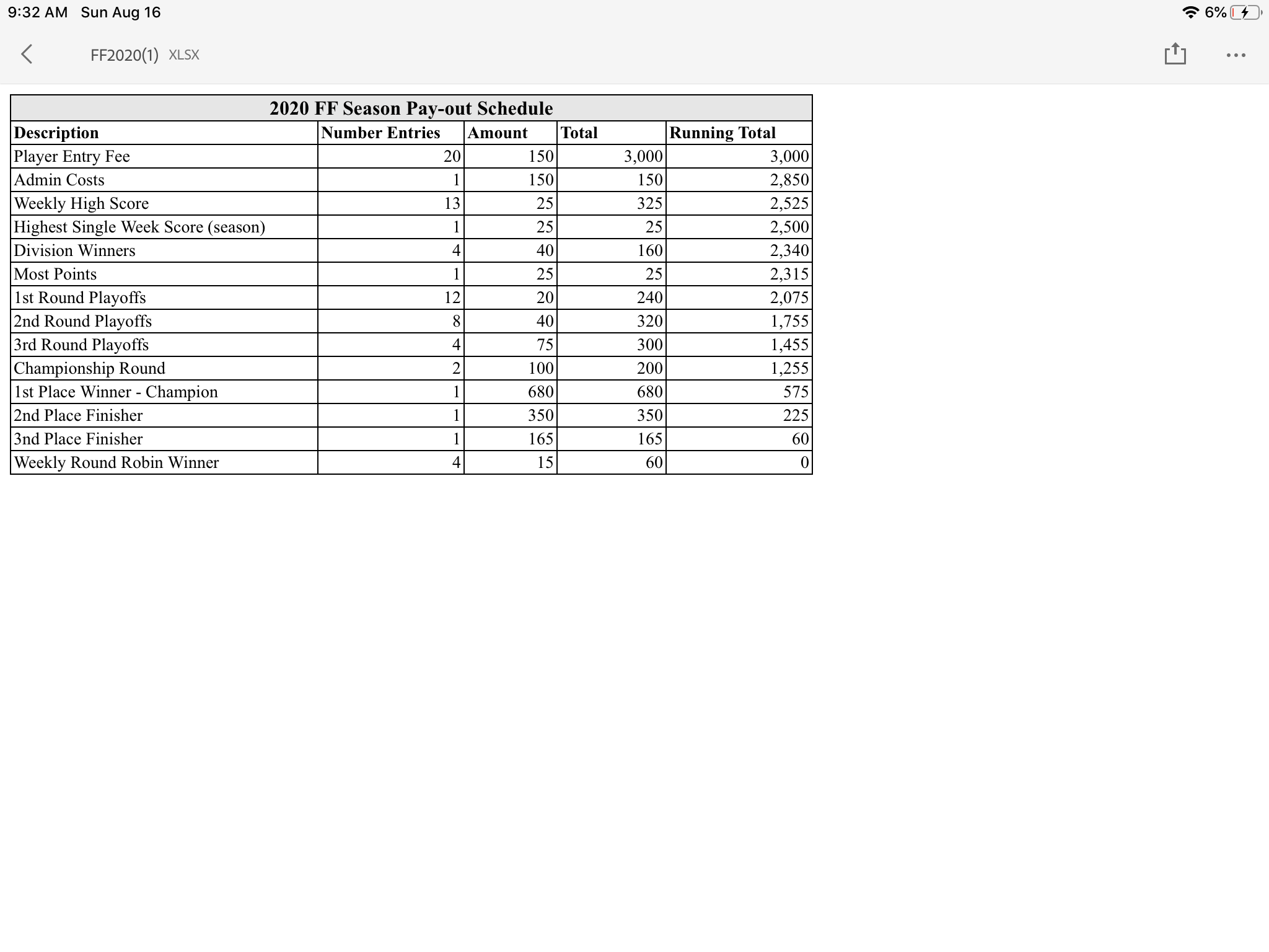 | 2022 FFL Season Pay-Out Schedule | ||||